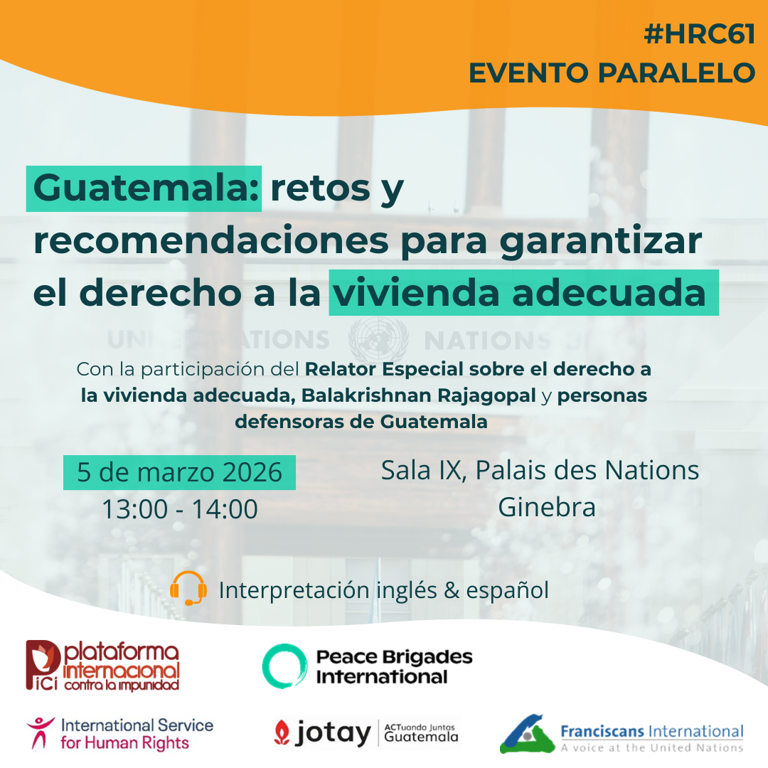 This event will feature the participation of the Special Rapporteur on the right to adequate housing, Sandra Calel; representative of the Verapacense Union of Peasant Organizations, Rigoberto Juárez Mateo; ancestral authority and coordinator of the plurinational ancestral government, Luz Emilia Ulario; former mayor of Santa Lucía Utatlán; and will be moderated by Yannick Wild of PBI.